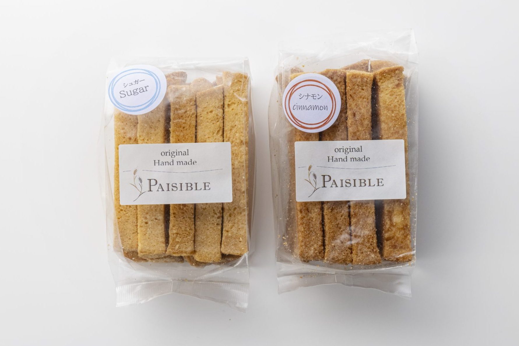 薫り広がる風味の良いシナモンパウダーとバターシュガーを丹念にスティックに塗り、サクッとたべられ「一本食べたらやめられない」 気分になりますよ。